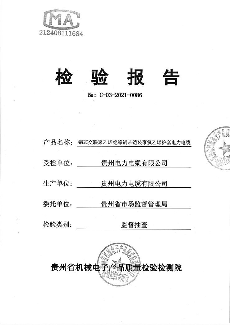 鋁芯交聯(lián)聚乙烯絕緣鋼帶鎧裝聚氯乙烯護套電力電纜 檢驗報告